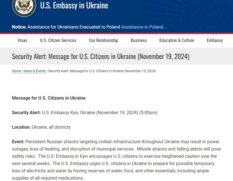 „Постојаните руски напади насочени кон цивилната инфраструктура низ Украина може да резултираат со прекини на електрична енергија, на греењето и прекин на општинските услуги. Ракетните напади и паѓањето на остатоци ќе претставуваат ризици за безбедноста. Амбасадата на САД во Киев ги предупредува граѓаните на САД да бидат зголемени на претпазливост во следните неколку недели. Амбасадата на САД ги повикува американските граѓани во Украина да се подготват за можна привремена загуба на електрична енергија и вода со тоа што ќе имаат резерви на вода, храна и други неопходни работи, вклучително и доволно резерви на сите потребни лекови“,