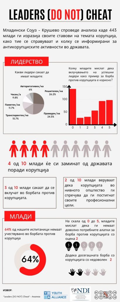 Корупцијата е главна причина за иселување на младите. Четворица од десет млади изјавиле дека ќе ја напуштат државата поради степенот на корупција, додека секоја трета млада личност изјавила дека токму корупцијата е главна мотивација да се приклучи и да придонесе во борбата против коруптивните дејства. Само четири отсто, пак, рекле дека ваквата состојба ги тера да станат дел од синџирот на корупцијата.