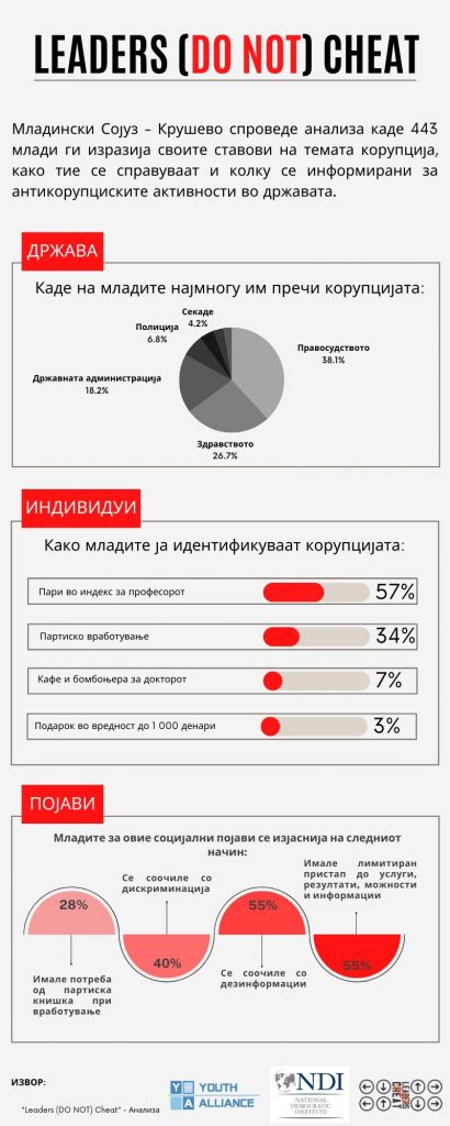 „Прашани за тоа како ја идентификуваат корупцијата, младите испитаници во најголем процент изјавиле дека тоа претставува ’пари во индекс за професорот/ката‘ (57 отсто), една третина дека тоа се партиските вработувања, а најмал процент дека тоа се ’кафе и бонбониера за докторот‘ (7 отсто), односно ’подарок во вредност до 1 000 денари; (3 отсто)“,