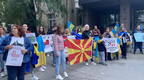 Македонија(ФОТО) Украинците во земјава на протест пред руската амбасада во Скопје: Подмолен напад врз украинските градови