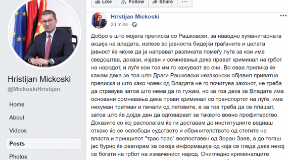 МакедонијаМицкоски ја потврди автентичноста на пораките до Рашковски: Бурно ќе реагирам на секоја информација за богатење на грбот на народот