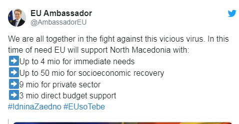 Жбогар: 66 милиони евра од ЕУ за Македонија за справување со последиците од коронавирусот
