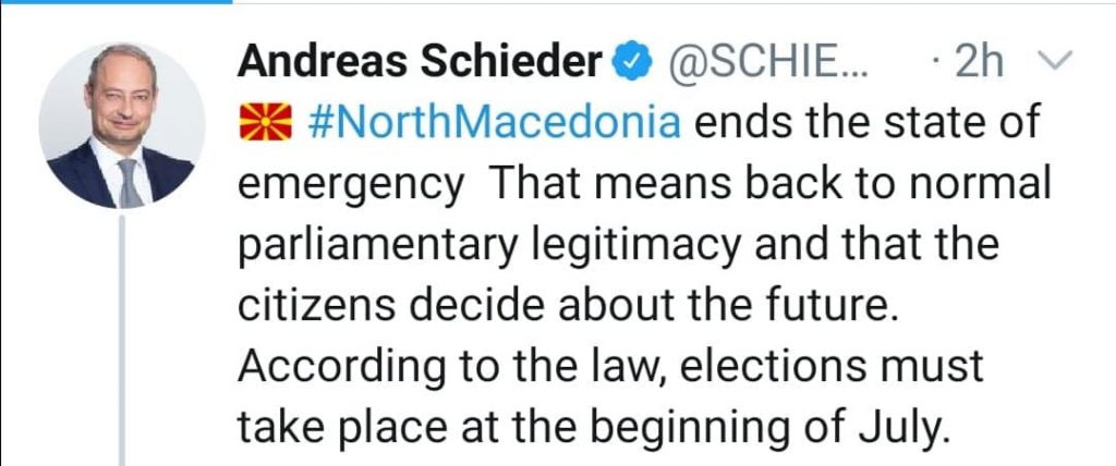 „Северна Македонија ја прекина вонредната состојба. Тоа значи враќање кон парламентарната легитимност и граѓаните да одлучат за иднината. Според законот, изборите мора да се одржат на почетокот на јули“,