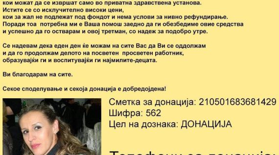 Искра Гашевска е скопјанка која боледува од канцер чиј третман вклучува скапи третмани кои можат да се...