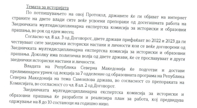 Според Протоколот што на 17 јули во Софија го потпишаа министрите за надворешни работи на Северна Македонија и на Бугарија, Бујар Османи и Теодора Генчовска, во рок од еден месец од потпишувањето (на Протоколот) двете држави треба да ги објават на интернет-страниците на двете влади веќе усвоените препораки од досегашната работа на Заедничката мултидисциплинарна комисија за историски и образовни прашања. Тој рок е на самиот истек