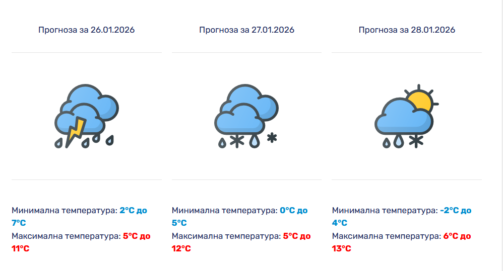 Синоптичарите најавија претежно облачно време во текот на денов. Во текот на ноќта претежно во југоисточните делови ќе има повремени локални врнежи од дожд, а на повисоките планини од снег. Ќе дува умерен, повремено засилен ветер од југоисточен правец.