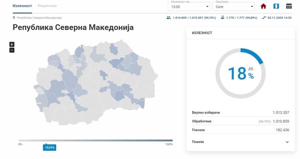 Процентот, како што може да се види на веб-страницата на ДИК, е изведен врз основа на обработени 99,89 избирачки места или во апсолутни бројки до средината на денешниот изборен ден гласале 182 436 граѓани од вкупно 1 013 357 запишани гласачи.