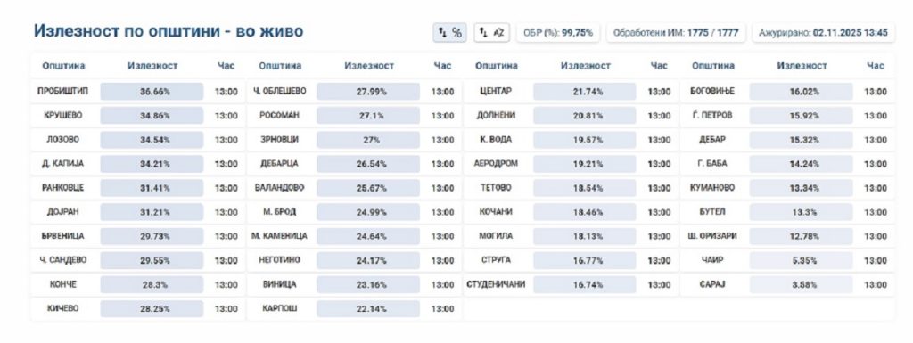 По општини, до 13 часот најголема е излезеноста во Пробиштип – 36,66 отсто, потоа следат Крушево – 34,86 проценти, Лозово со 34,54 проценти, Демир Капија – 34,21 отсто и Ранковце со 31,41 процент.