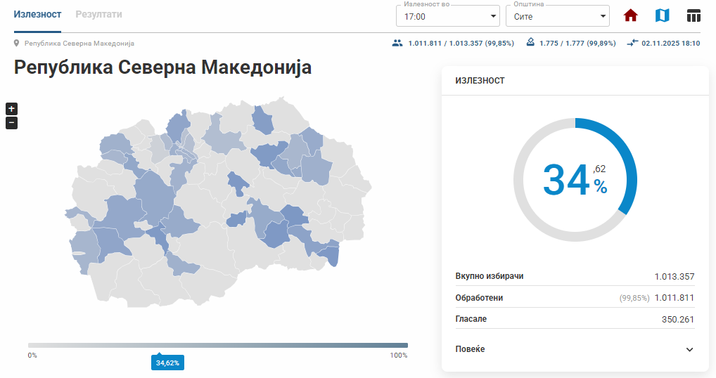 Процентот на излезеност на гласачите е согласно обработени 99,89 отсто од избирачките места. Во апсолутни бројки, до 17 часот на гласање излегле 350 261 граѓани од вкупно 1 013 357 кои имаат право на глас во вториот круг од локалните избори за градоначалник, што се одржува во 32 општини и Градот Скопје.