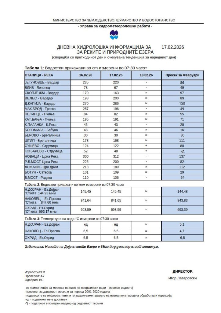 Нивоата на Охридското, Преспанското и на Дојранското Езеро, пак, се во рамките на февруарскиот просек