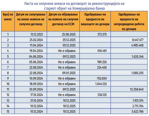 „Договорот за јавна набавка за реконструкцијата на поранешниот објект на ‘Комерцијална банка’ е склучен во април 2023 година. Тендерската постапка е отпочната во 2022 година и во неа учествувале 4 фирми (‘Strabag AG’, ‘Жикол Струмица’, ‘Ак-Инвест Тетово’ и ‘Бауер БГ Скопје’). По спроведена електронска аукција и дополнителното намалување на првично дадените понуди, како најповолна понуда врз основа на критериумот ’најниска ценаʻ била избрана понудата на „Бауер БГ“. Изборот на економски оператори со најниска цена, која потоа значително се зголемува, како во случајот, ја доведува во прашање целата постапка за јавна набавка, односно почитувањето на принципите на транспарентност, конкуренција и еднаков третман на економските оператори“,