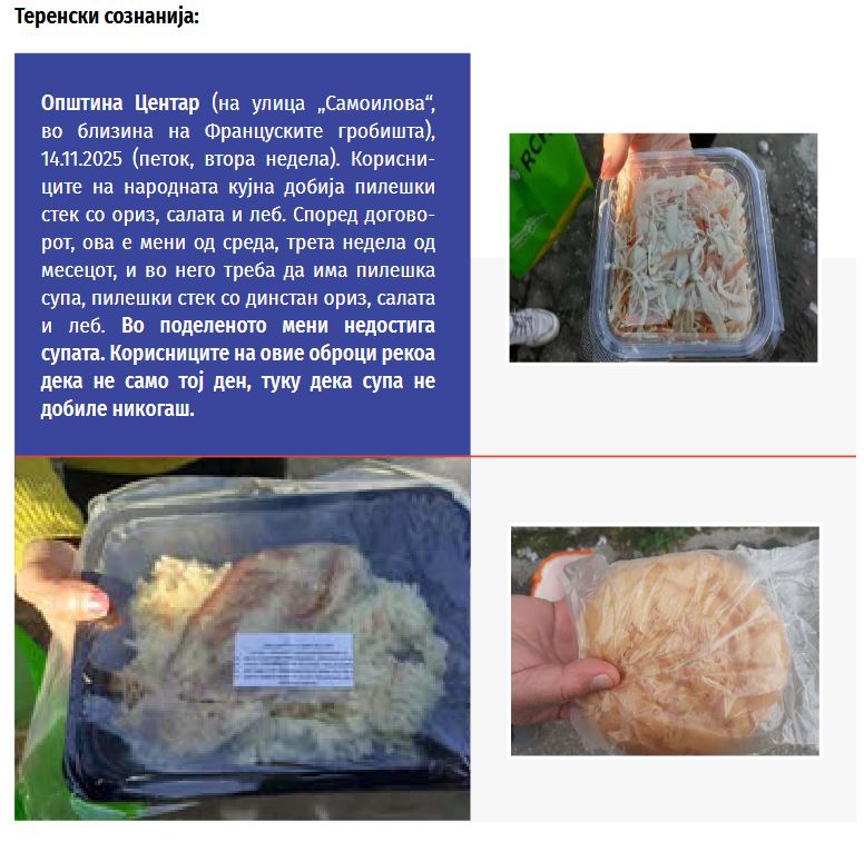 Според Центарот за граѓански комуникации, иако тендерската документација на ресорното Министерство упатува на постоење простории што служат како народни кујни, во пракса, на седум од девет наведени локации храната се дели директно на улица.