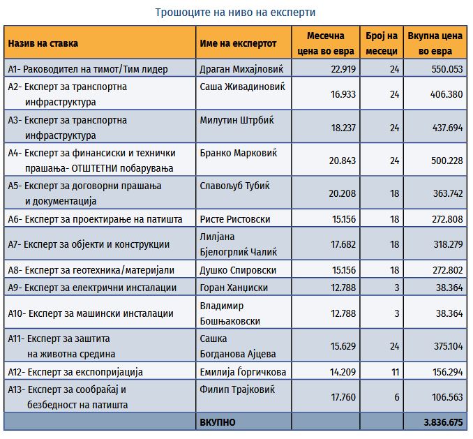„Договорот следува две години по формирањето на посебната проектна единица за изградба на автопатските делници и откако бројот на вработени во претпријатието се зголемил за 42 отсто (од 352 на 501). Хонорарите на ангажираниот македонско-српски експертски тим се движат меѓу 13 000 и 23 000 евра месечно, по експерт. Сепак, најголем дел од експертите ќе бидат ангажирани по 50 отсто од нивното време, а дел и помалку“, се вели во истражувањето на Центарот за граѓански комуникации
