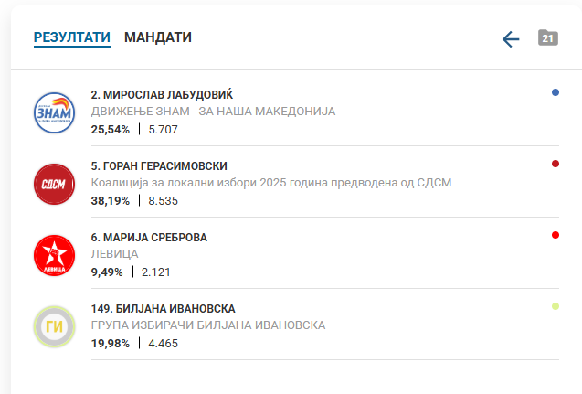 Во првиот круг, тој има околу 2 100 гласа кусок од ВМРО-ДПМНЕ и ЗНАМ за Советот.