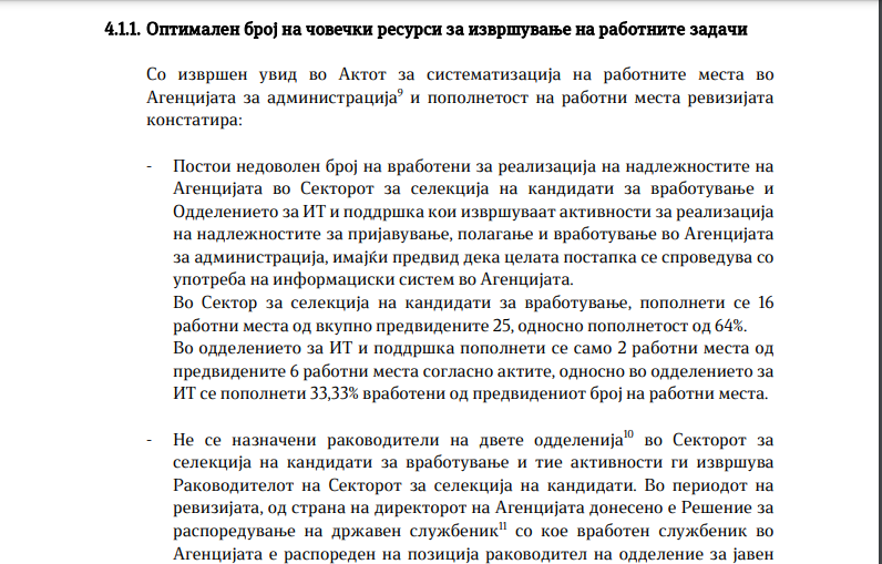 „Таквата состојба предизвикува преоптовареност на постојните вработени и го доведува во прашање навременото и ефикасното извршување работните задачи. Не е обезбедена секундарна локација со потребна информатичка опрема и софтвер заради непречено одвивање на постапката во случај на прекин на работата на информацискиот системот на примарната локација, каде би продолжиле постапките и активностите на Агенцијата. Ваквата состојба може да предизвика прекин во реализација на активностите за објавување на јавен оглас, спроведување на испит и тест на личност на кандидатот“,