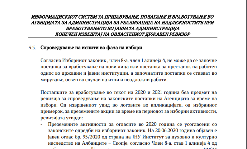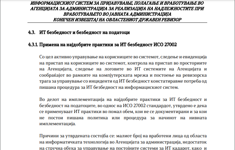 „Констатирани се одредени активности во системот кои се однесуваат за веќе завршени јавни огласи за вработување пред распишување на изборите во 2020 година и 2021 година. Отсуствува ограничување на мрежниот пристап до компјутерите во просторијата за полагање и до модулот и базата на прашања за испити, со време на пристап, корисничко име на вработениот кој пристапил и акции кои ги извршил при пристапот, а отсуствува автоматизирана процедура за преземање на базата на прашања за испити во надлежност на МИОА, процедура за ажурирање на промени и ревизорска трага за спроведена контрола при ажурирање на базата на прашања за испити од страна на Агенцијата за администрација со што постои ризик за навремено евидентирање на промените во базата на прашања кои треба да се усогласени со тековните промени на законската регулатива и ризикот од грешки при мануелно внесување на промените“,