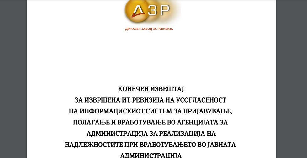 Нема оптимален број човечки ресурси за извршување на работните задачи во одделението за ИТ и поддршка и недостасуваат дел од процедурите за спроведување на промени во Базата на прашања и „контрола на четири очи“, констатирал Државниот завод за ревизија, по извршената ИТ-ревизија во Агенцијата за администрација за реализација на надлежностите при вработувањето во јавната администрација.