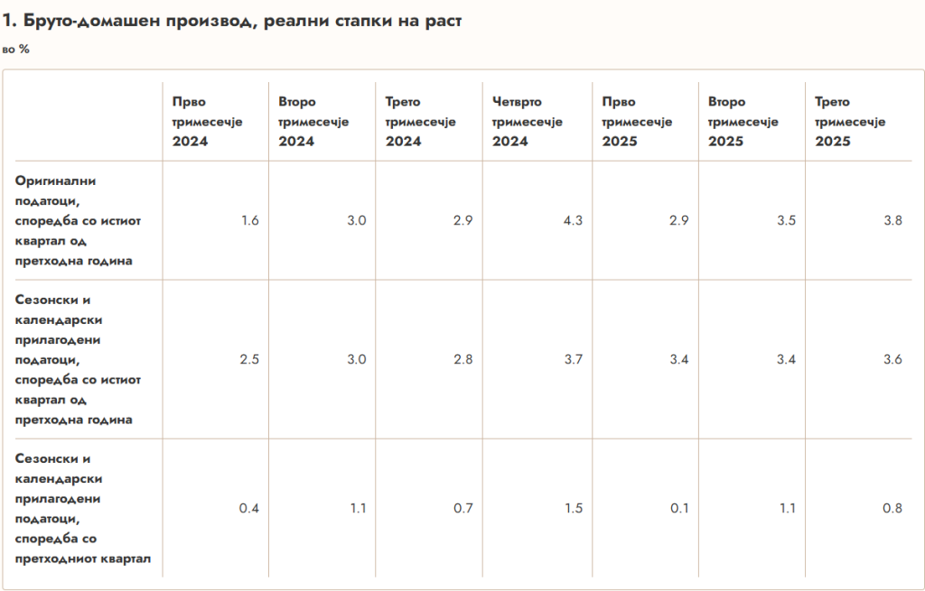 Како што се вели во извештајот на ДЗС, според сезонски и календарски приспособени податоци, стапката на раст на БДП во третото тримесечје од годинава во однос на тоа од 2024 година е 3,6 отсто.