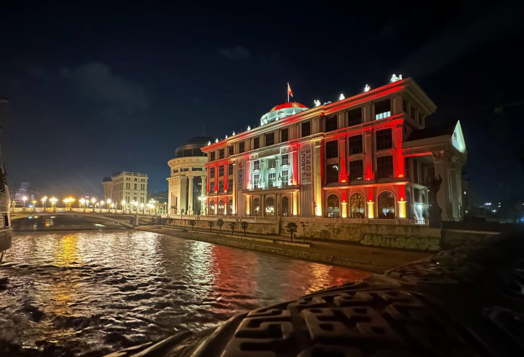 Зградата на Министерството за надворешни работи (МНР) вечерва свети во боите на германското знаме во пресрет на утрешната посета на земјава од страна на шефицата на германската дипломатија Аналена Бербок.