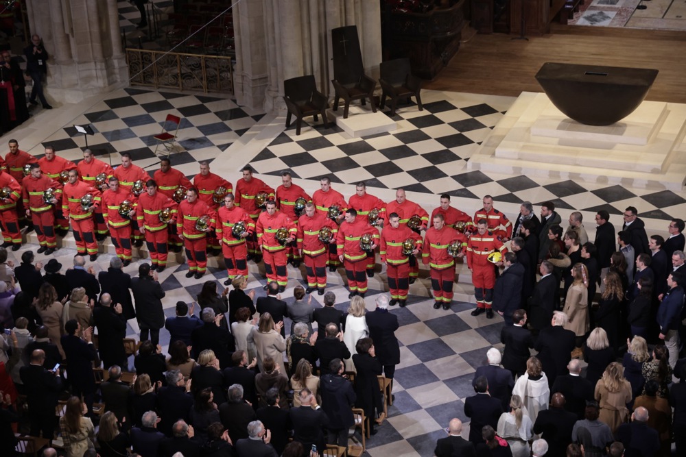 Службите за итни случаи кои помогнаа да се спаси готското ремек-дело и луѓето вклучени во реставрацијата на објектот добија овации додека парискиот надбискуп Лоран Улрих тропна три пати на вратите на Нотр Дам пред симболично повторно да ја отвори катедралата. Богослужбата траеше два часа.