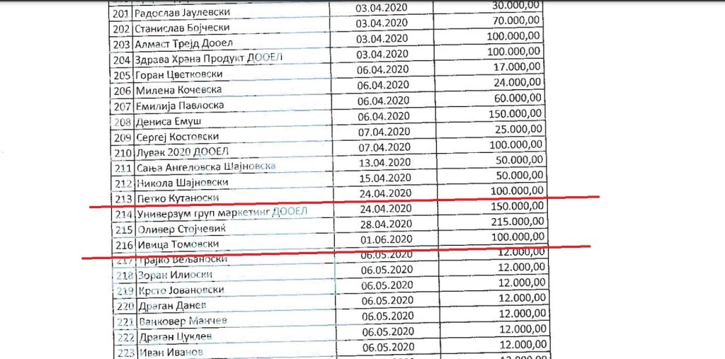 На прес-конференцијата, Кузеска покажа документи, на кои се гледа колку пари Томовски донирал во ВМРО-ДПМНЕ, како и дека меѓу донаторите е и неговиот зет, Петко Кутаноски.