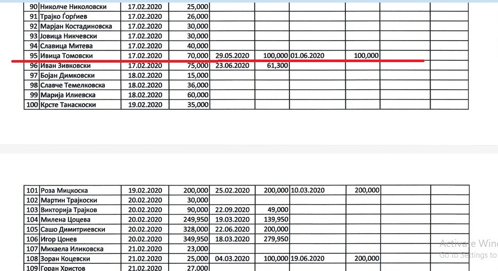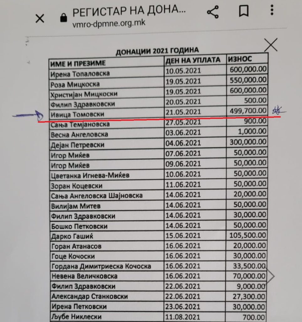 „Тој е еден од оние што најмногу сакаат да се истакнат со големи суми. Само во 2021 година донирал 8 000 евра на ВМРО-ДПМНЕ. 499 700 денари, 100 000 денари, 70 000 денати, 100 000 денари, редовно Томовски уплаќа на сметката на партијата. И не само тој, донатор е и неговиот зет, Кутаноски. Семејна фирма, семејни донации“,
