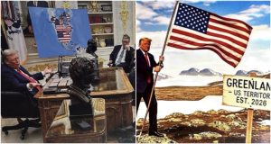 На една од фотографиите се гледа како Трамп седи во Овалната соба со европските лидери, а покрај … Продолжи со читање (ФОТО) Трамп објави фотографии на кои Канада и Гренланд ги „покри“ со американско знаме