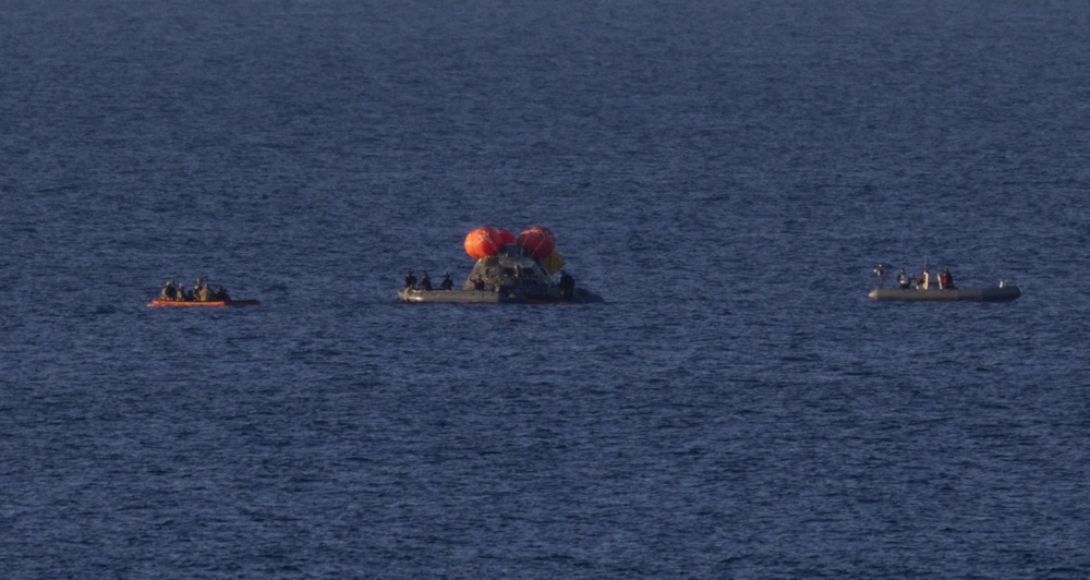Инженерите прво спроведоа неколку дополнителни тестови додека капсулата Орион беше во вода пред да го исклучат вселенското летало и да го предадат на спасувачки тим од американскиот воен брод.