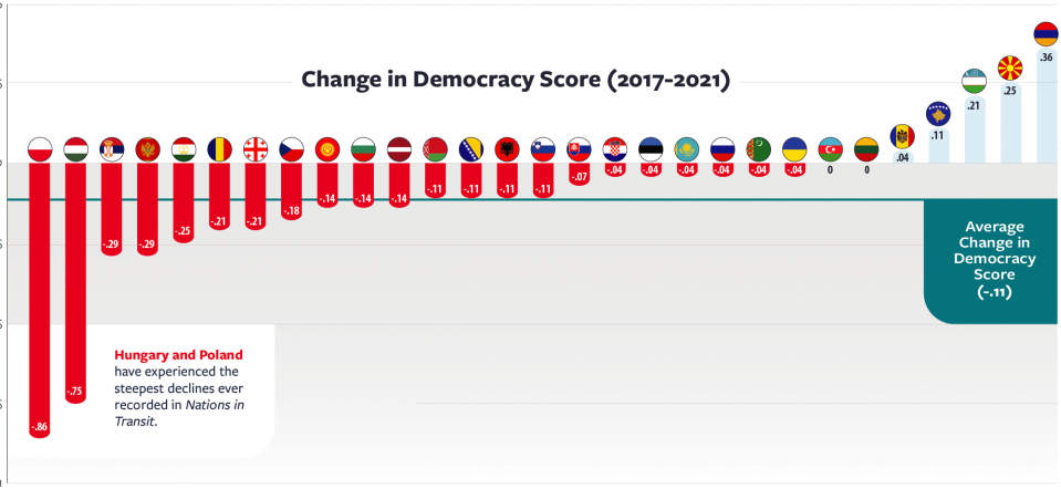 Во извештајот „Држави во транзиција во 2021 година“, кој ги опфаќа настаните од 2020 година, вкупно 18 земји бележат пад на индексот на демократија, само шест имаат напредок, а во пет држави состојбата останала непроменета.
