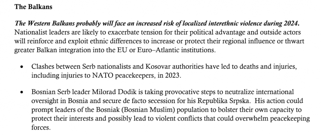 Во извештајот насловен како „Годишна проценка на американското разузнавање за заканите за 2024 година“, во делот каде што се споменува Балканот, меѓу другото, се посочува: