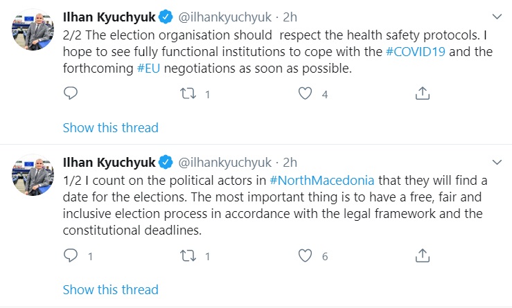 „Сметам дека сите политичките чинители во Северна Македонија треба да најдат датум за изборите. Најважно е да се организираат слободни, фер и инклузивни избори во согласност со законската рамка и уставните рокови. Организацијата на изборите треба да биде во согласност со здравствените безбедносни протоколи. Се надевам дека што поскоро ќе видиме целосно функционални институции за да може да се справат со ковид-19 и претстојните преговори со ЕУ“,