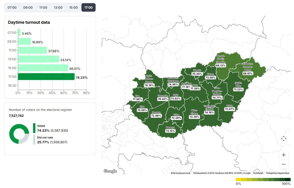 Според официјалните податоци на Националната изборна канцеларија на Унгарија, до 17:00 часот излезеноста изнесува 74,23 отсто, што веќе го надмина досегашниот рекорд од 73,51 отсто од 2002 година.