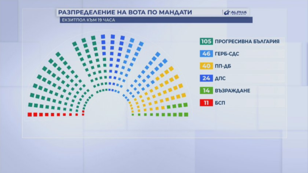 Според податоците на „Алфа рисрч“, „Прогресивна Бугарија“ би освоила 105 пратенички места во 240-члениот парламент. ГЕРБ-СДФ добива 46 мандати, ПП-ДБ – 40, ДПС – 24, Преродба – 14, додека БСП – Обединета левица би имала 11 пратеници.