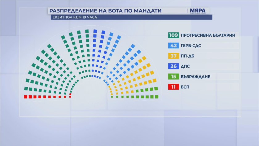 Слични, но нешто поразлични бројки објави и агенцијата „Мјара“, според кои „Прогресивна Бугарија“ освојува 109 мандати, ГЕРБ-СДФ – 41, ПП-ДБ – 38, ДПС – 26, Преродба – 15 и „БСП – Обединета левица“ – 11.