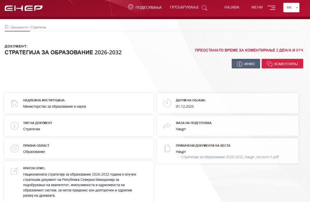 Инаку, министерката се осврна на оваа тема, одговарајќи на новинарско прашање околу тоа дали до крајот на годината стратегијата ќе биде донесена и какви предлози и препораки се пристигнати досега, имајќи предвид дека документот извесно време е поставен на Електронски национален регистар на прописи на Република Северна Македонија (ЕНЕР).
