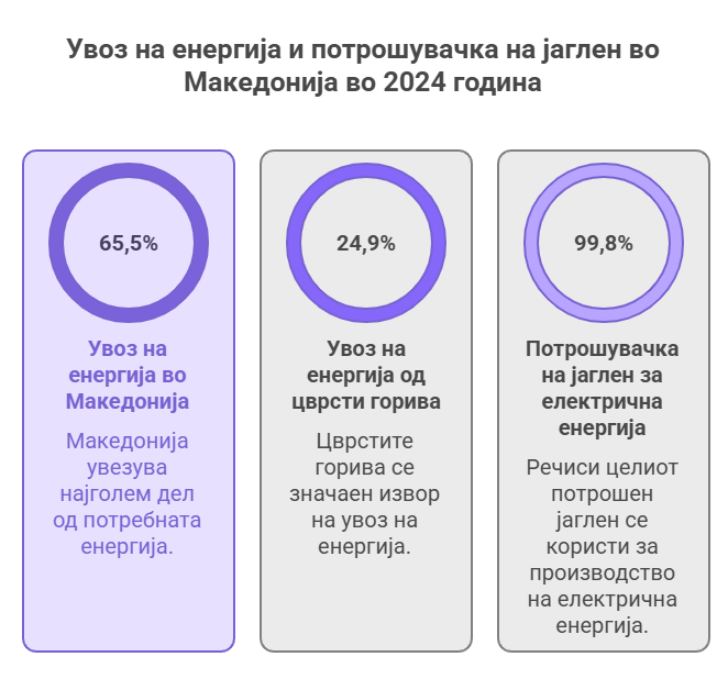 Амбициозните рокови засега изгледаат тешко остварливи, ако се има предвид дека главните производствени капацитети – термоелектраните РЕК Битола и РЕК Осломеј, изградени во 80-тите со капацитет од околу 810 MW, се далеку од нивото потребно за постепена замена со зелени извори. Иако 2030 година е амбициозна, таа е и делумно олеснување во однос на првичниот план земјата да се откаже од јагленот до 2027 година. Официјалните податоци за 2024 година покажуваат дека Македонија увезува 65,5% од потребната енергија, дека 24,9% од неа доаѓа од цврсти горива, а дури 99,8% од потрошениот јаглен се користи за производство на електрична енергија, јасен показател за длабоката зависност од јаглен.