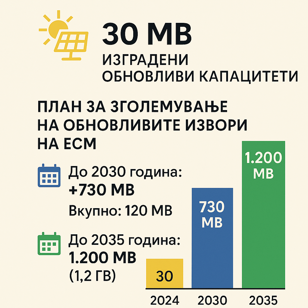 Трансформацијата на старите рударски локации во зони за чиста енергија е важен дел од новата енергетска стратегија. Иако досега се изградени само околу 30 MW соларни капацитети, ЕСМ планира значително зголемување: 700 MW обновливи извори до 2030 година и уште 500 MW до 2035 година, односно вкупно 1,2 GW.