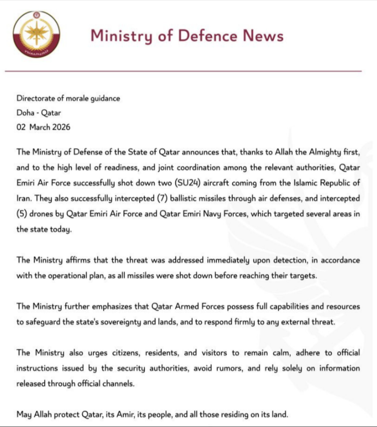 „Катарските воздухопловни сили успешно соборија два авиони СУ-24 што доаѓаа од Исламската Република Иран. Исто така, успешно пресретнаа седум балистички ракети и пет беспилотни летала што денес насочија повеќе области во земјата“,