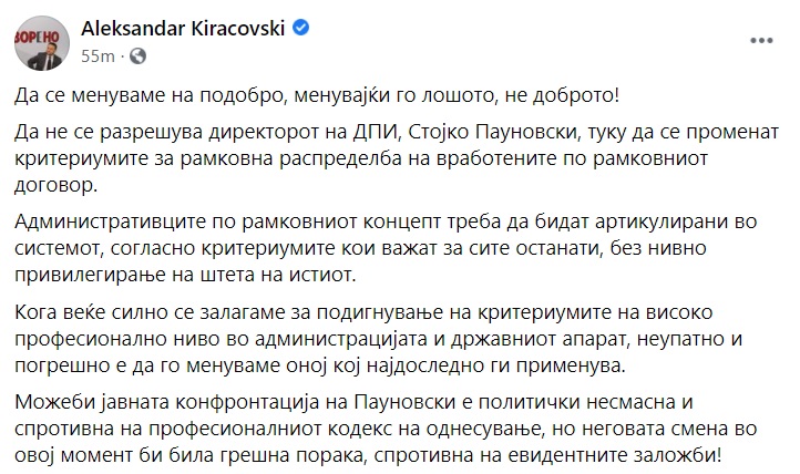 Кирацовски: Не го разрешувајте Пауновски туку сменете ги критериумите за рамковна распределба