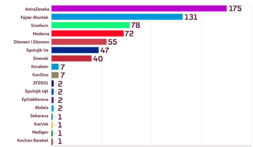 Листата изгледа вака: „Астра Зенека“ во 175 земји, „Фајзер/Бионтек“ се користи во 131 земја, „Синофарм“ во 78, „Модерна“ во 72, „Џонсон и Џонсон“ во 55, „спутник В“ во 47, „Синовак“ во 40 земји и „Коваксин“ во само 7 земји