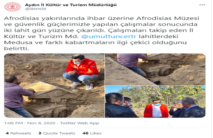 „Дирекцијата за култура и туризам на градот Ајдин во Турција, на 8 ноември 2020 објави дека биле откриени два саркофази во близина на античкиот град Афродизијас, како резултат на ископувањата спроведени со Музејот Афродизијас. Турските медиуми известиле за овој настан, и во нивните статии може да се видат фотографиите што фејсбук-страницата намерно ги злоупотребила за дезинформирање на македонската јавност, со цел да се предизвика незадоволство и недоверба во придобивките од Преспанскиот договор. Со тоа, објавата воедно поттикнува и омраза кон соседна Грција, а користи и недоличен јазик“,