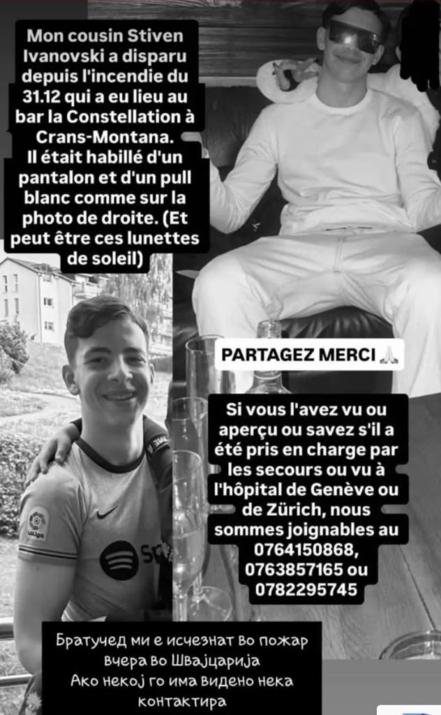 „Апел за помош: Семејството упатува молба до сите кои можеби го виделе Стивен, или имаат информација дали бил примен во болниците во Женева или Цирих, веднаш да контактираат на следните телефонски броеви: 076 415 0868076 385 7165078 229 5745. Братучед ми е исчезнат во пожар вчера во Швајцарија. Ако некој го има видено, нека нè контактира“,