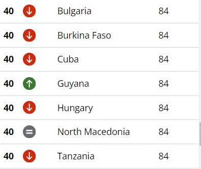 Осумдесет и четвртото место на ранг-листата според Глобалниот индекс за перцепција на корупцијата за 2025 година земјава го дели со соседна Бугарија, Унгарија, Буркина Фасо, Куба, Гвајана и Танзанија