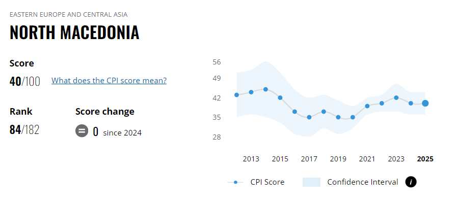 Северна Македонија се најде на 84. место од вкупно 180 земји на ранг-листата според Глобалниот индекс за перцепција на корупцијата за 2025 година објавена од „Транспаренси интернешнл“.