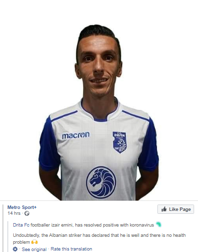 Фудбалерот Изаир Емини е првиот македонски фудбалер кој е позитивен на коронавирус. Триесет и четиригодишниот тетовец, кој сега настапува за клубот Дрита во Косово, оваа информација ја објави на својот фејсбук-профил.