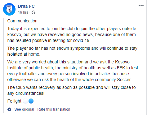 Подоцна и клубот ја потврди веста на својот профил на социјалната мрежа и ги повика здравствените власти во Косово да продолжат со тестирањата на сите фудбалери и на фудбалските работници за да не се доведе во ризик целата заедница.