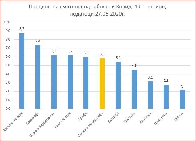 Процентот на смртност од вкупниот број потврдени случаи на ковид-19 во Северна Македонија изнесува 5,8 %, а со повисок процент на смртност во регионот се Словенија со 7,3%, Босна и Херцеговина со 6,2%, Грција со 6%, информираат од Министерството за здравство.