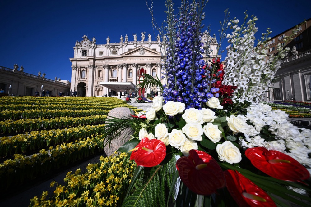 Плоштадот „Свети Петар“ беше украсен со пролетни цветови, со редови нарциси и илјадници виолетови, црвени и бели цвеќиња наредени за велигденската миса.