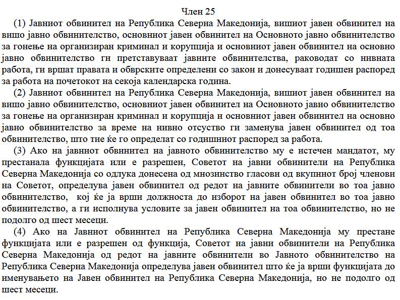 „Ако на јавниот обвинител на јавното обвинителство му е истечен мандатот, му престанала функцијата или е разрешен, Советот на јавни обвинители на Република Северна Македонија со одлука донесена од мнозинство гласови од вкупниот број членови на Советот, определува јавен обвинител од редот на јавните обвинители во тоа јавно обвинителство, кој ќе ја врши должноста до изборот на јавен обвинител во тоа јавно обвинителство, а ги исполнува условите за јавен обвинител на тоа обвинителство, но не подолго од шест месеци“,