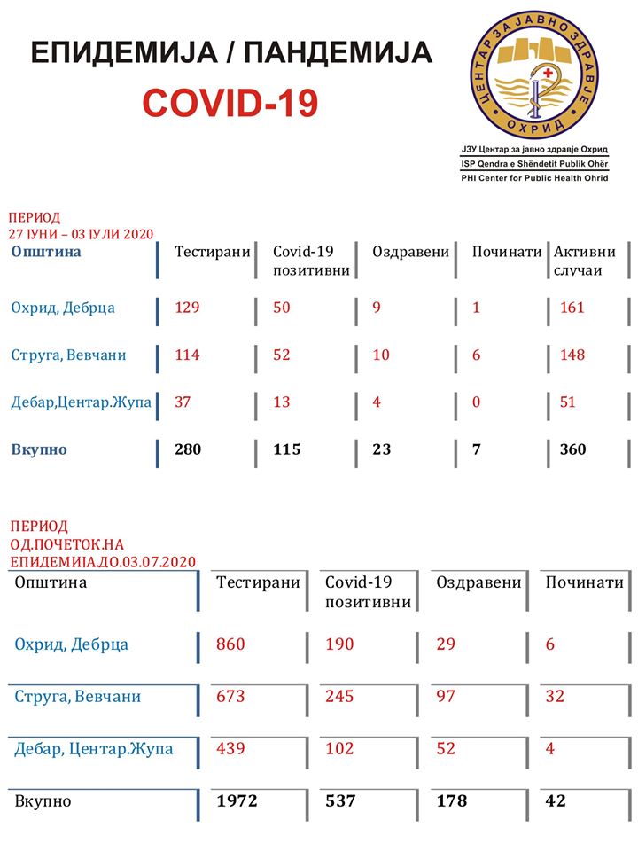 Ова се податоците од седмичниот билтен (од 27 јуни до 3 јули) на ЦЈЗ – Охрид, кој ги покрива општините Охрид, Дебрца, Струга, Вевчани, Дебар и Центар Жупа.